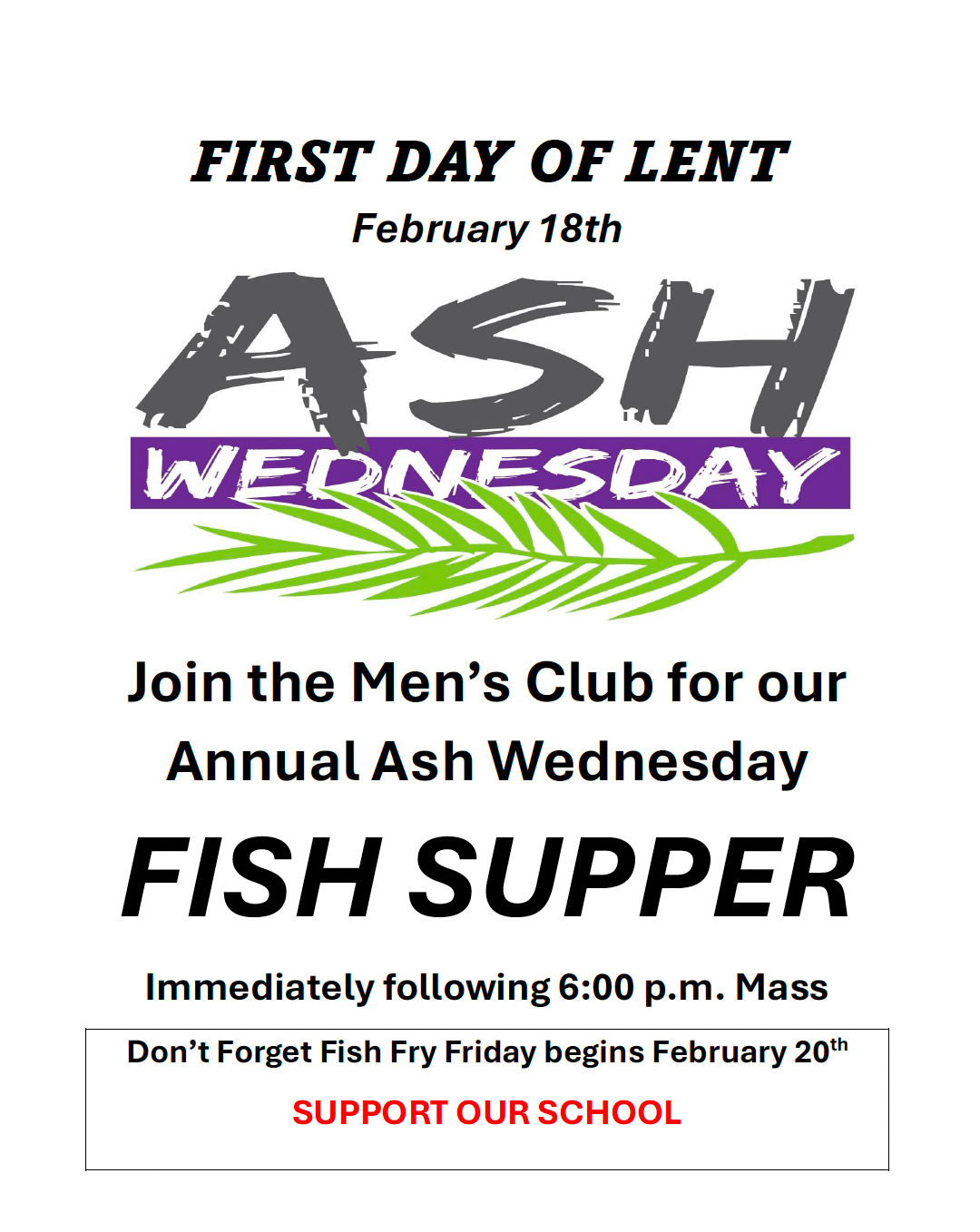 Join us for our Ash Wednesday Fish Supper at 7:00 PM (after the 6:00 PM Mass). We look forward to seeing you there and to celebrate the beginning of the Lenten Season!