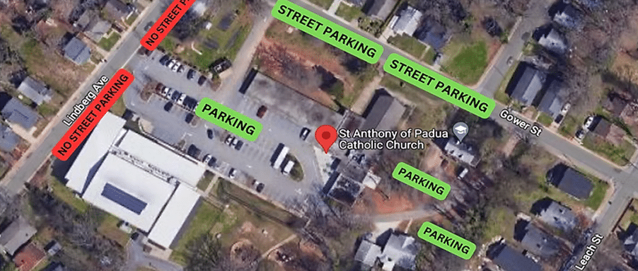 Parking is available in the main parking lot in front of the school and church; in the unpaved areas by the old friary, and on Gower Street. We highly discourage parking on Lindberg Avenue due to the narrow street and to avoid parking in front of residents' driveways. Please see the photo below for reference: